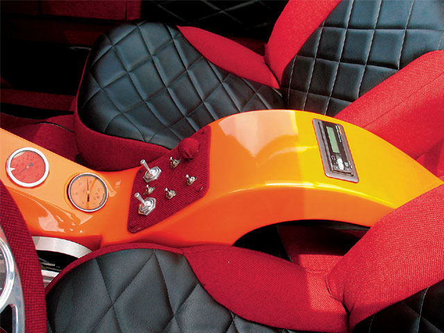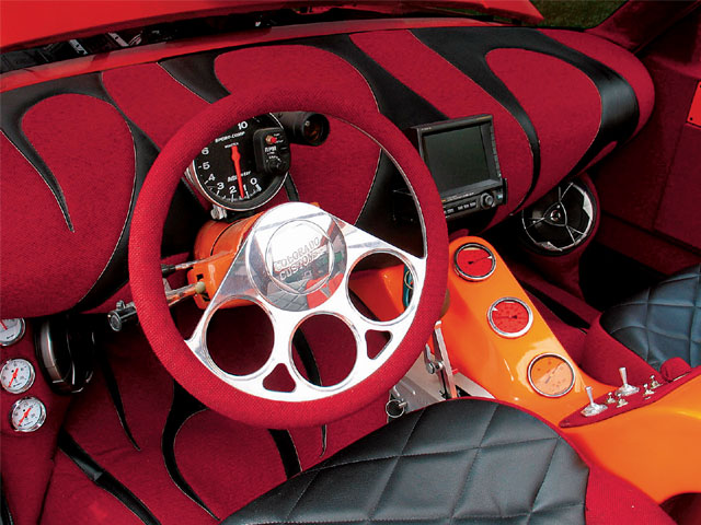 Interior Colorado Custom billet aluminum steering wheel / hand-made custom fiberglass dash by Daniel Simpson / custom-upholstered vinyl seats, dash, and floor / tweed flooring / all interior stitch work by Daniel Simpson / interior paint by Patrick / full-length ragtop roof with clear vinyl used instead of stay-fast material in three panels / custom fiberglass center console with air pressure gauges and controls painted Sunset Pearl by Patrick