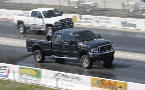 As the race night continued, trucks from as far away as Texas lined up to the start line. There were complete amateurs driving totally stock trucks, and some professional setups running nitrous and L.P. injection systems. An interesting example of the latter class was Chad Simper's 2002 blue Duramax 2500. Modifications included a Van Aken computer module, aFe Stage II intake, four-inch MagnaFlow exhaust, Sun Coast reworked Allison transmission with a billet torque converter and HD clutch packs, HD valve bodies, a Nitrous Express nitrous system, and a Powershot 2000 propane-injection system. Chad said he didn't activate those for this event, but he still took the best times of the day with a 14.100 and 14.505 in the Open Class. He said his ultimate goal is high 11s. When we left at midnight, they were still burning rubber.
